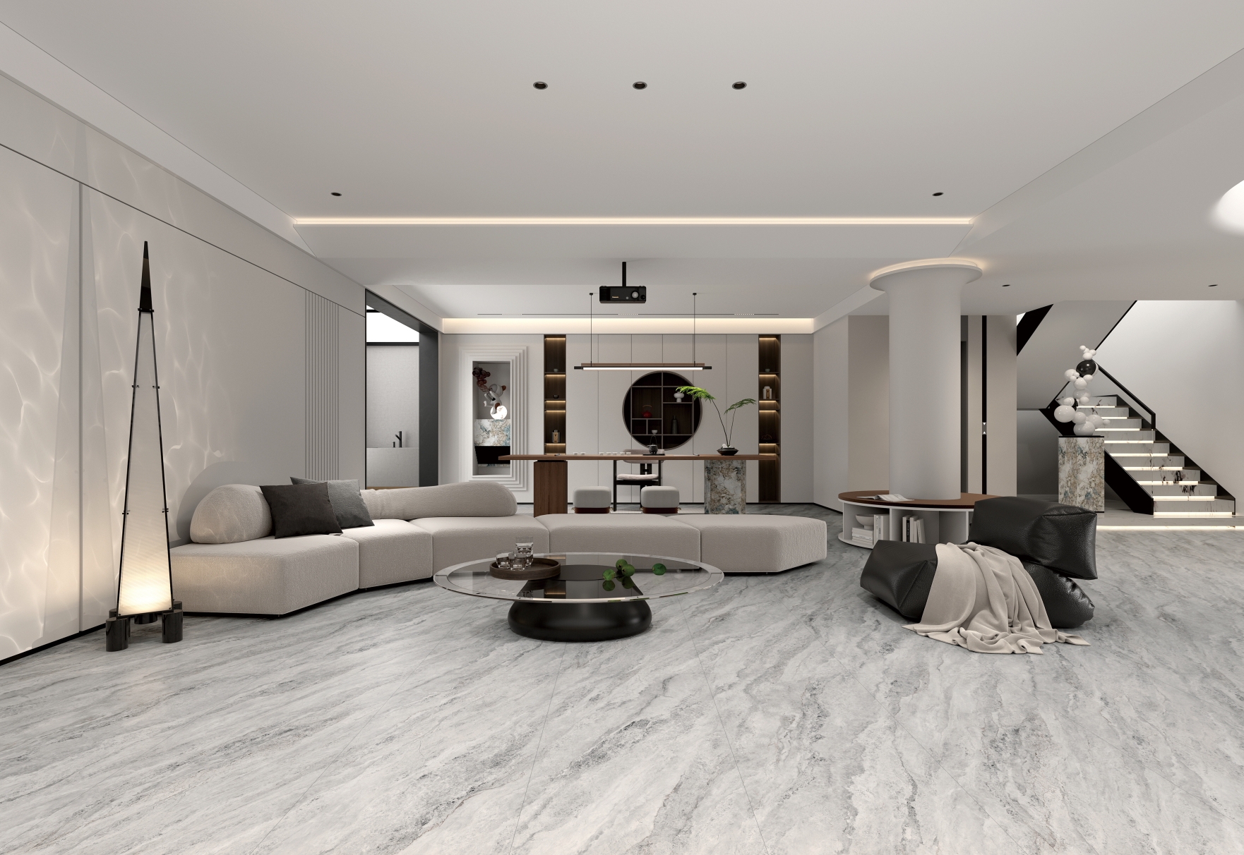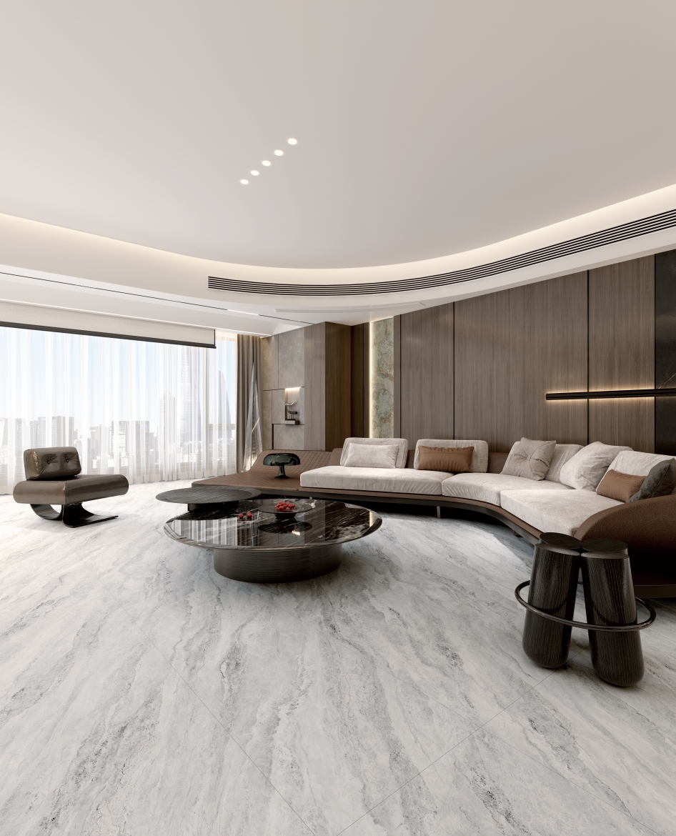 剛?cè)岵?jì)的灰色和凹凸立體的肌理質(zhì)感,在光影交錯(cuò)中更顯層次豐富;細(xì)膩交織的白色石紋悠然貫穿于灰色基底之上,與灰調(diào)自然相融,宛如清澈溪流輕盈穿梭于石隙之間,靈動而寧靜。