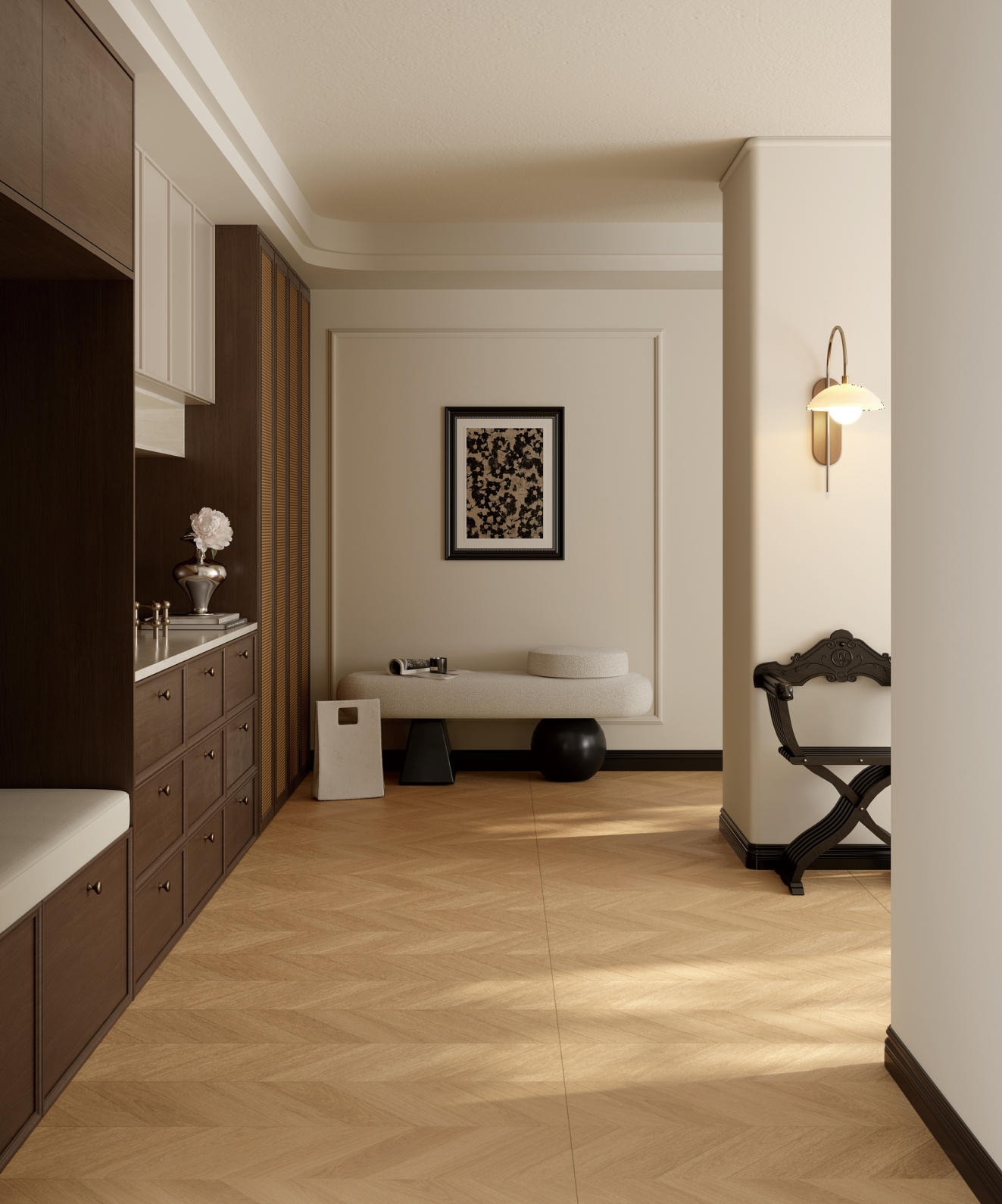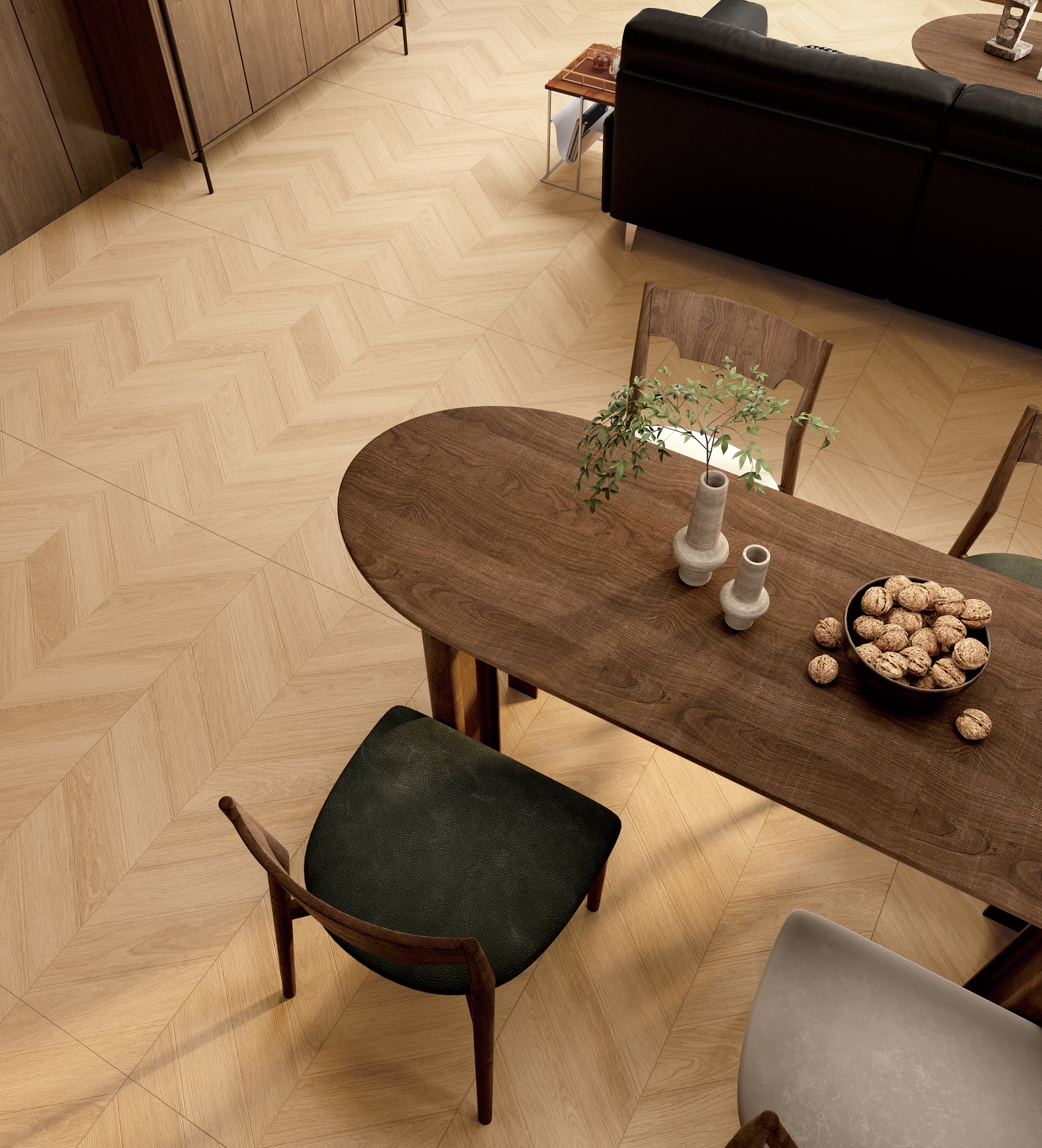 復(fù)刻西伯利亞珍貴自然木紋肌理,磚面以“魚骨拼”設(shè)計(jì)打造原木的自然觸感,密縫鋪貼于地面,令空間延伸感更強(qiáng)又兼具時(shí)尚感,能夠自由自在地“森”呼吸。